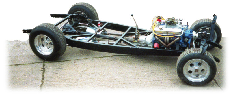 Complete rolling independant chassis for fully fendered coupe shown here complete with engine and trans, exhaust system and fully piped and connected braking system using rotors all round. As the cars are so light the rotor braked rear axle works much nicer, as there is no self servo action when using disc systems